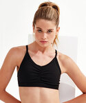 Medium-impact sports bra. Elasticated under bust for added support. Ruched detailing to centre front. Cross back straps with adjusters. Removable padding inner. Panel detailing to back with mesh detail centre. We recommend using block out vinyl and inks.Product contains no branded neck or waist label. Removable Kimble or looped garment tags. Inner seam label holds important product information on one label with a second label containing brand information which can be cut-away.